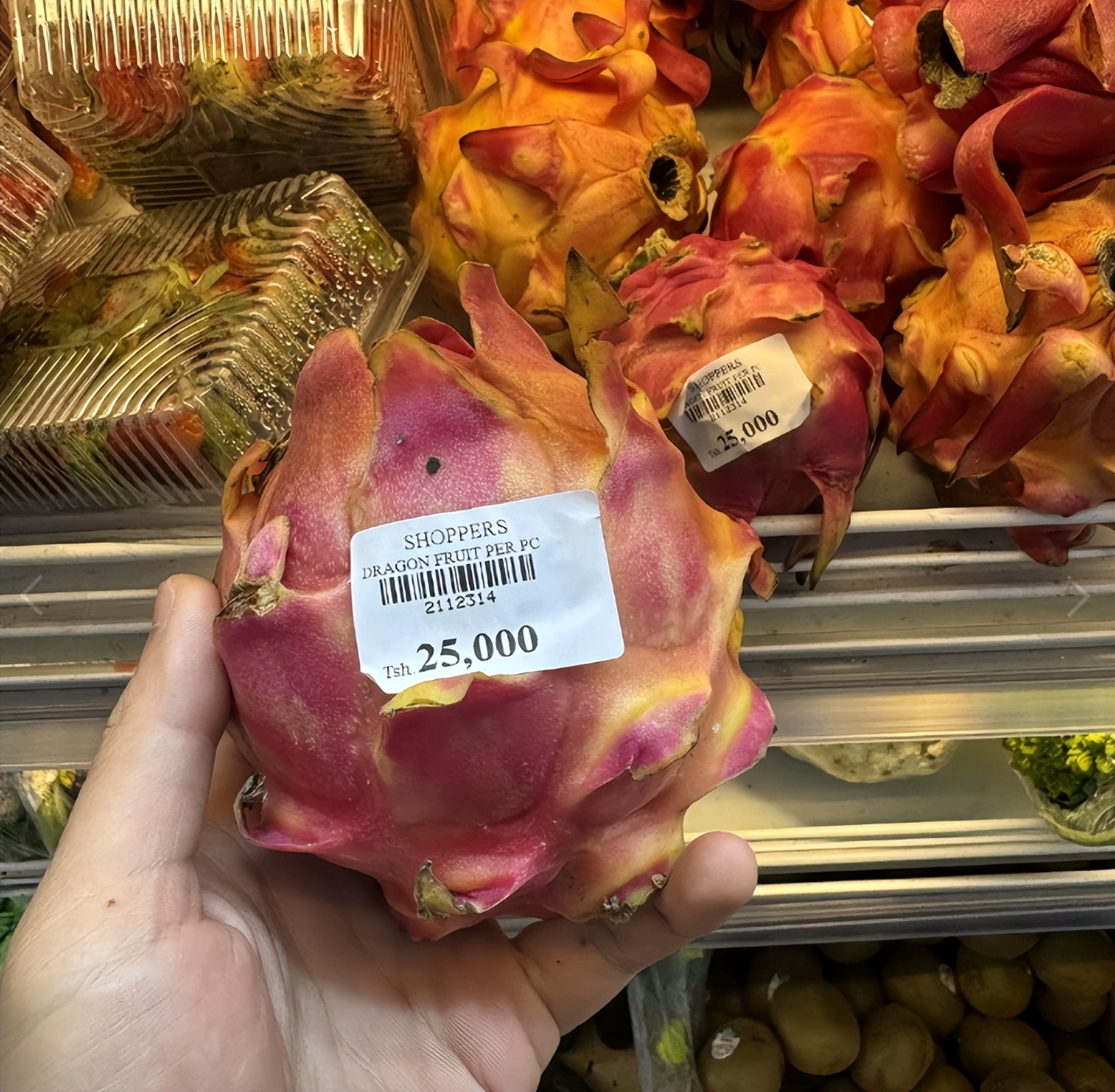 这一个火龙果在国外折合人民币72.5元,在我们这10块钱三个我才会买,还必须是红心的。