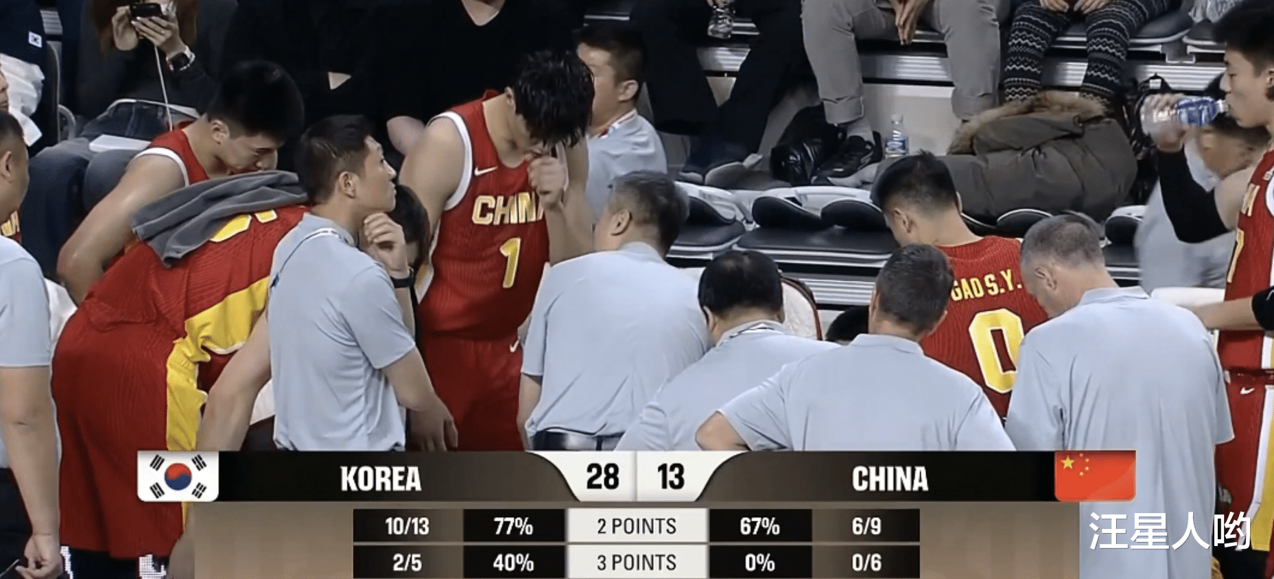 比赛开始后,我们应该怎么形容中国队的上半场呢?防守漏洞百出,投篮不进,可以说这是中国队在亚洲比赛中最差的一个上半场。而且在上半场结束前,韩国队还投进了一个压哨三分球,这个三分球,可以说是杀人诛心。