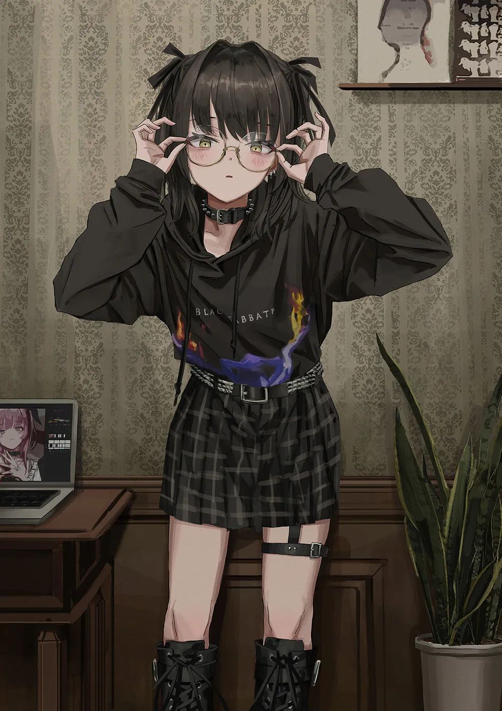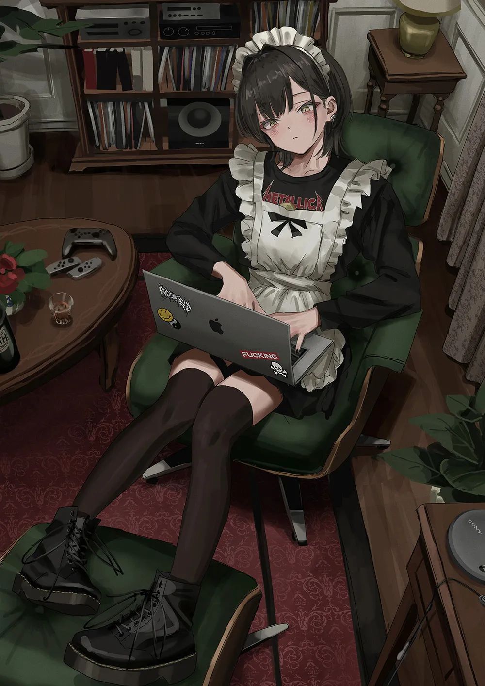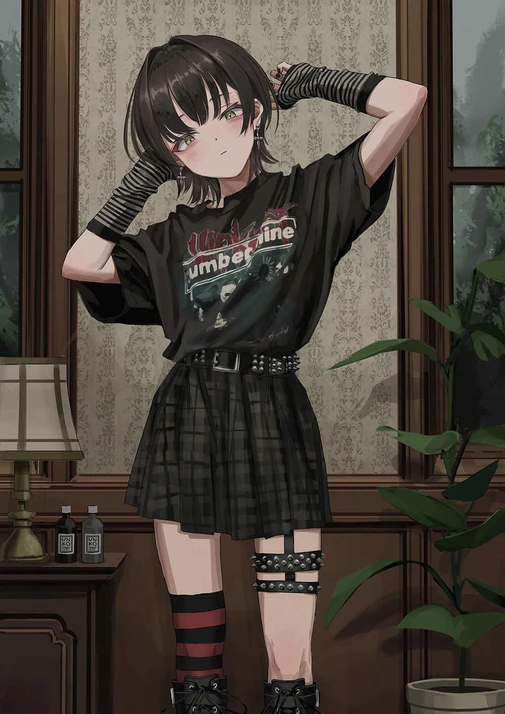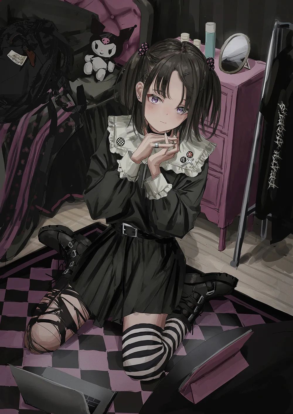 她的作品主要是暗色系的风格,内容多为各种穿着暗黑系服装的酷酷的女孩子