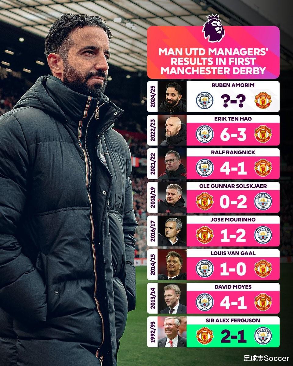 值得一提的是,明天凌晨阿莫林将迎来执教曼联的首场英超曼市德比。回顾过往战绩,最近6位曼联主帅在其曼市德比的首秀中均遭遇失利,分别是1992-93赛季的弗格森、2013-14赛季的莫耶斯、2014-15赛季的范加尔、2016-17赛季的穆里尼奥、2018-19赛季的索尔斯克亚、2021-22赛季的朗尼克、2022-23赛季的滕哈格。