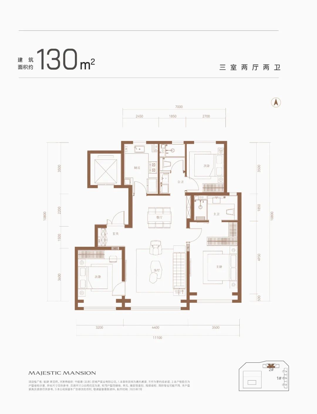 约130㎡三室两厅两卫,也是南北通透,三面宽朝南,面宽约11.1米,层高3.05米,客餐厨一体;次卧南向采光,光照时间充足,也带飘窗;主卧也是套房设计,质感而温暖。