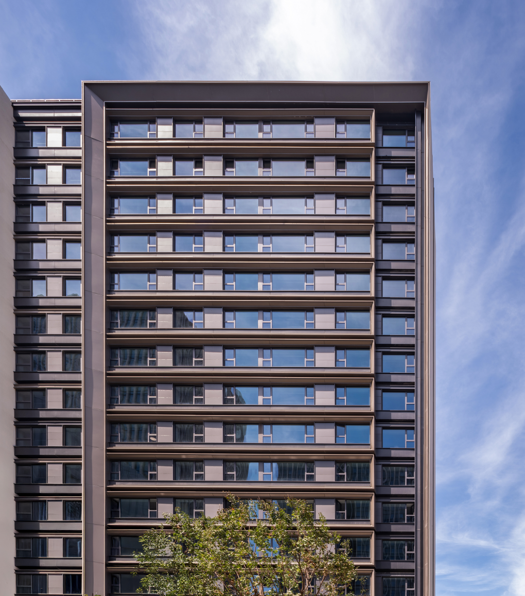 能建東誉府建筑外立面风格现代,巧妙运用香槟色铝板和浅灰色一体板加玻璃立面,以宝石切割工艺为灵感,通过斜切面独特的设计手法,打造出了简洁、精致、尊贵的品质感。