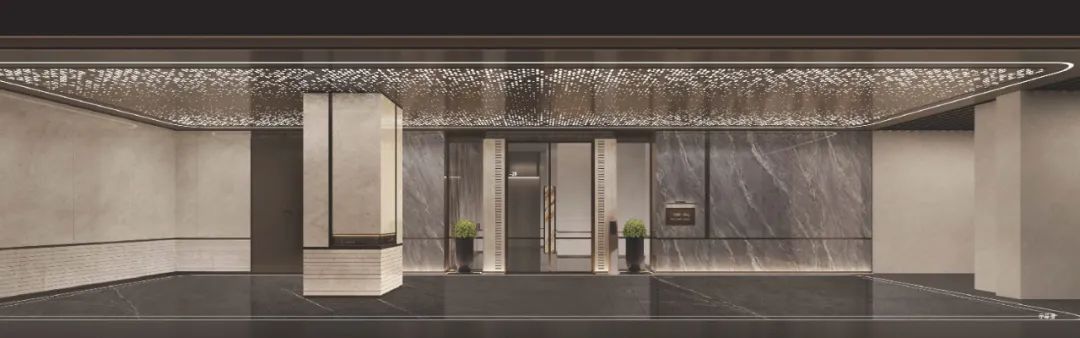 专属车马厅以星空顶(冲孔铝板)点亮归家仪式,衔接大堂的沉香棕岩板背景墙奠定奢石基调,地面墙面由深灰/浅色大板砖+金属线条勾勒,奢雅质感无处不在。
