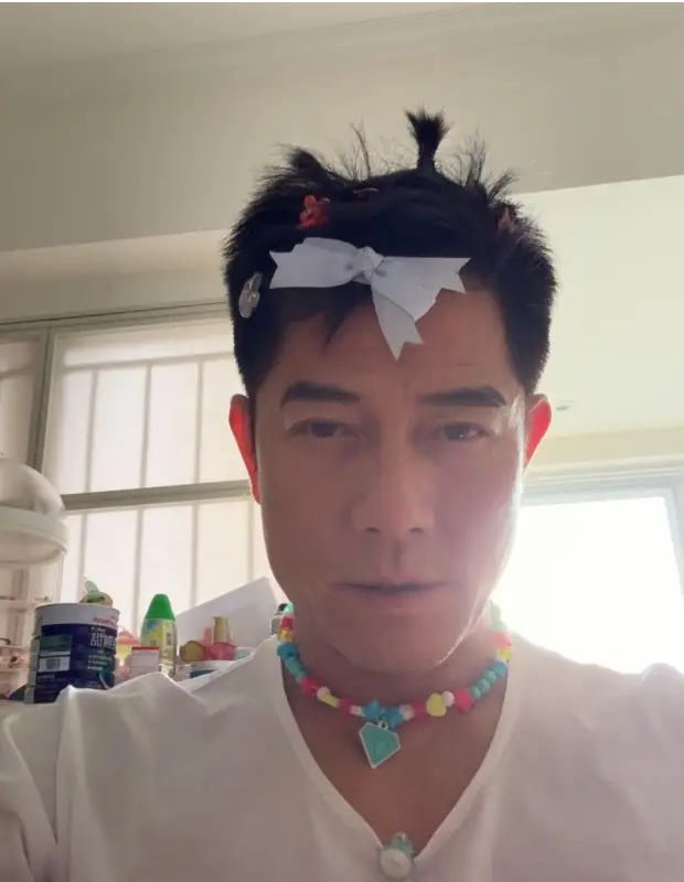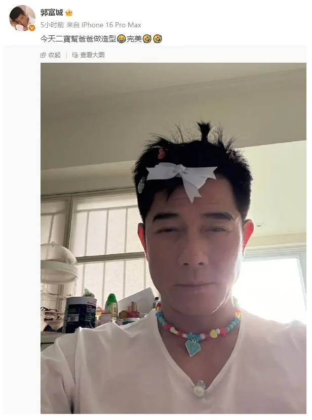 今日郭富城晒出被女儿郭咏萱打造的专属造型:粉嫩蝴蝶结发卡+七彩塑料项链,头顶还扎着小揪揪,硬汉秒变"郭姑娘"~