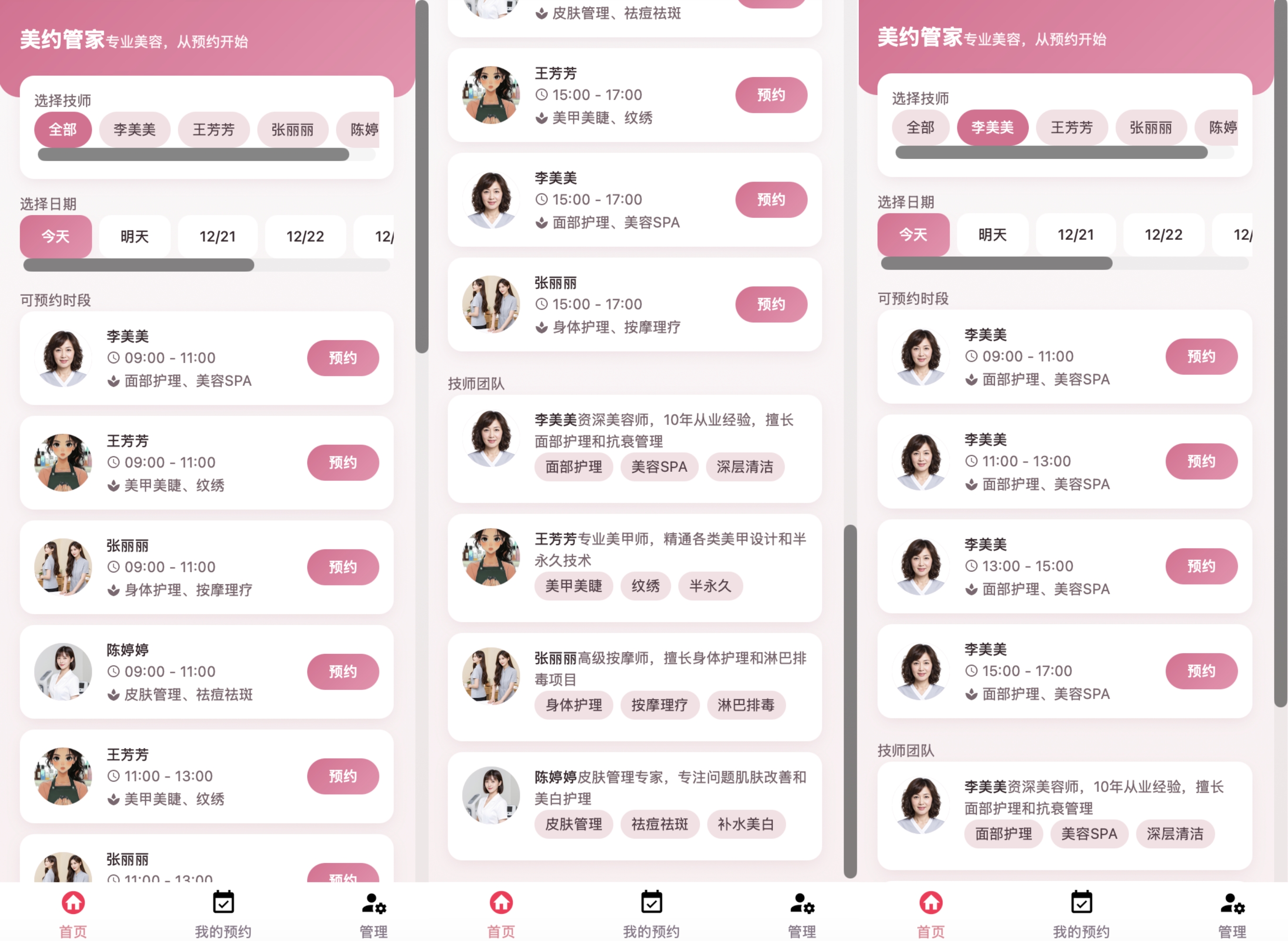 上图左一屏是按照日期和时段选技师,右一屏是按照技师选日期和时段,中间屏是首页拖到底部以后的技师团队介绍。
