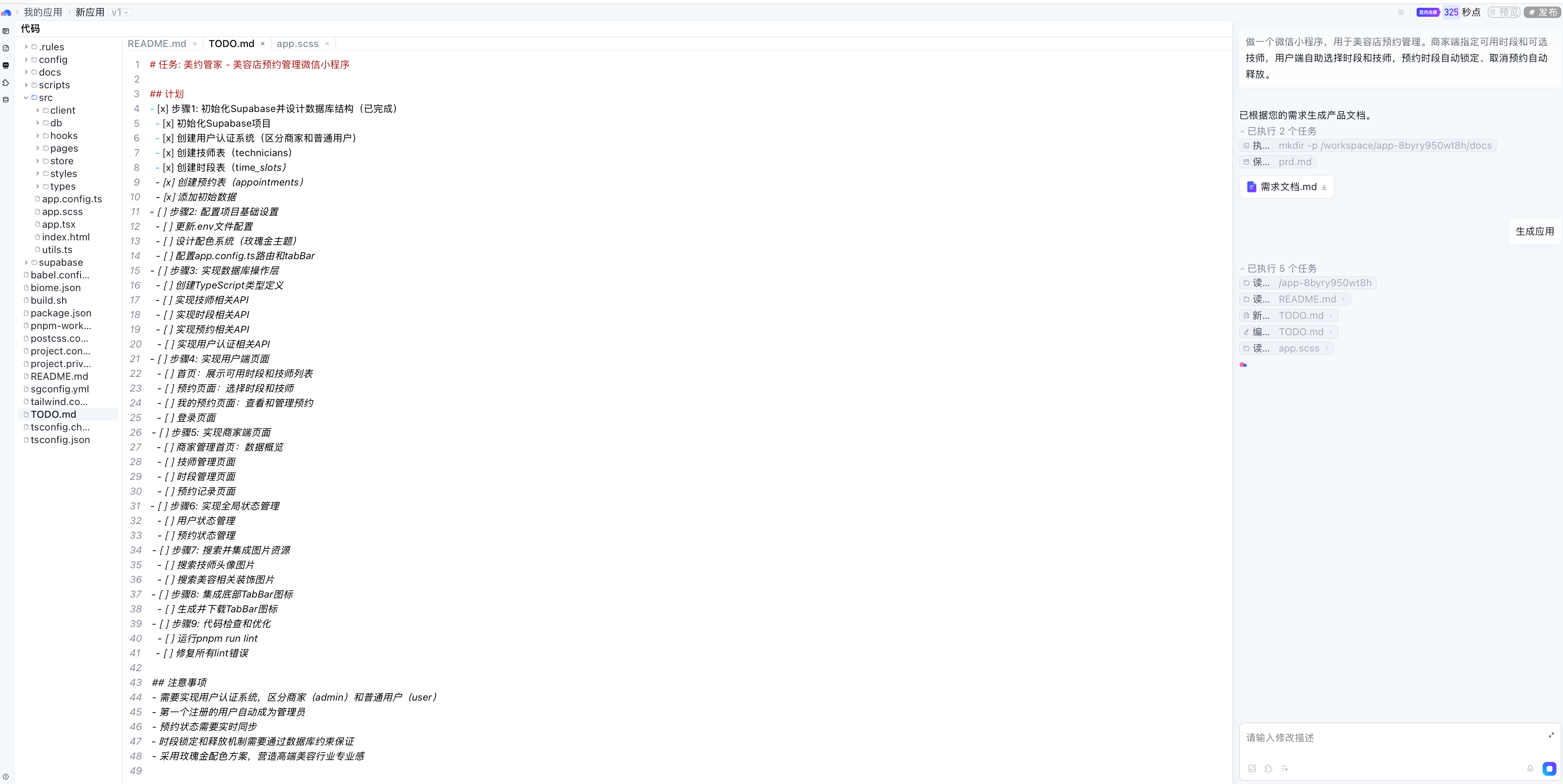 秒哒生成了一个开发计划。令我瞠目咋舌的是,它甚至加了一个「用户认证系统」,来区分我要求的「商家端」和「顾客端」!