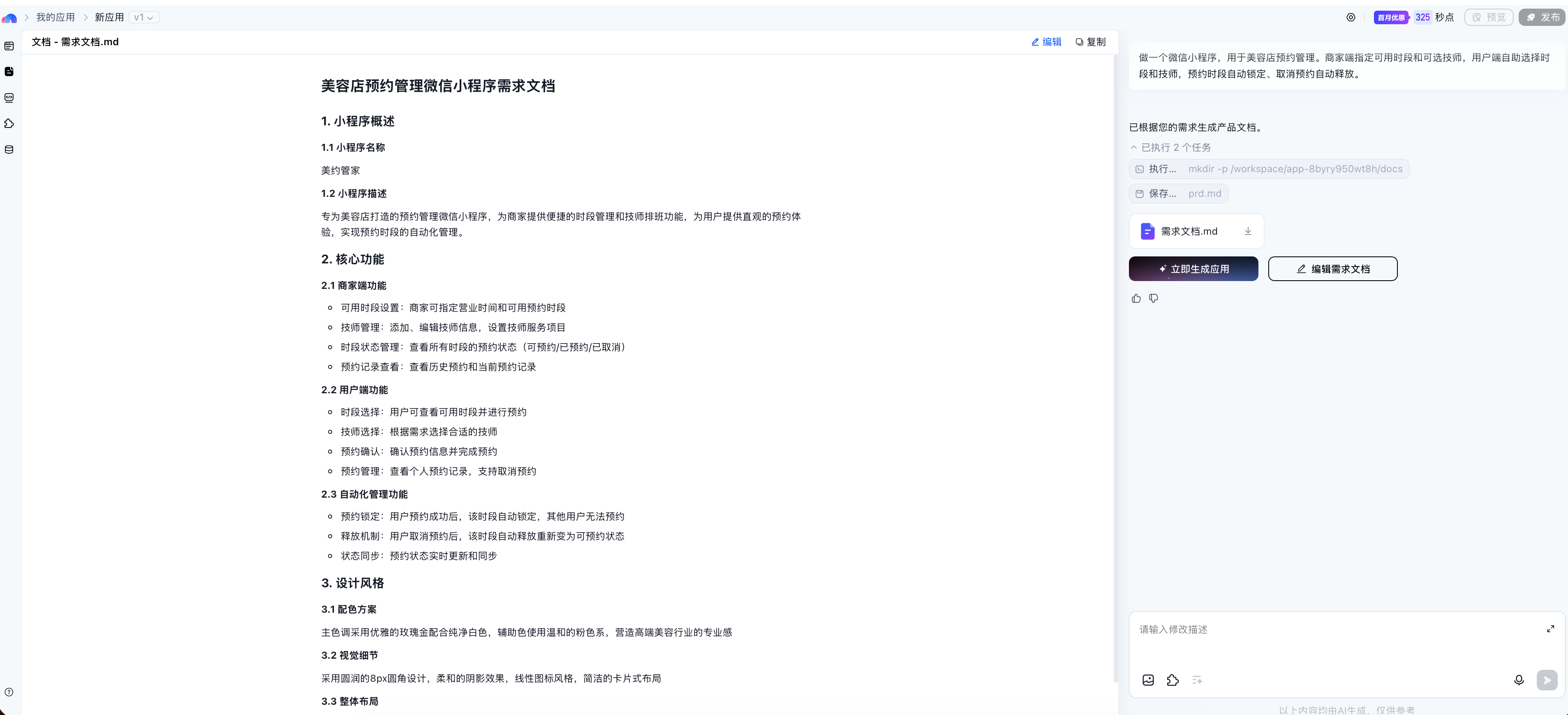 点右边「立即生成应用」。我倒要看看你是光有架势,还是有真本事!