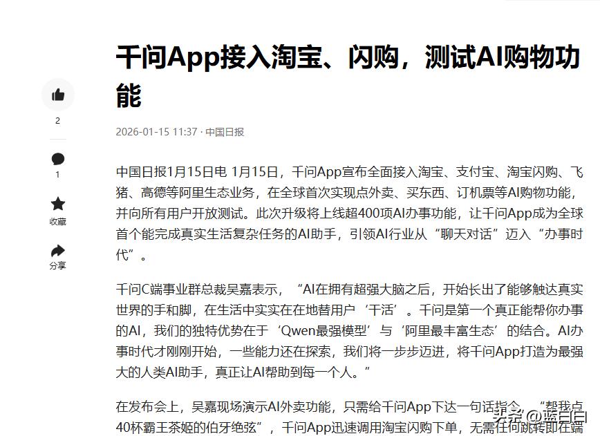 阿里千问重构生态,AI迈入“办事时代”:上午阿里千问发布会引发热议,核心亮点在于全生态整合——千问APP已全面接入淘宝、支付宝、飞猪、高德等阿里系产品,用户可在千问内直接联动各项生态功能。这意味着AI不再只是“聊天大脑”,而是真正拥有了“手脚”,能够深度参与日常消费、出行、支付等场景,标志着AI从“交互时代”正式迈入“办事时代”,相关生态链公司有望迎来估值重塑。