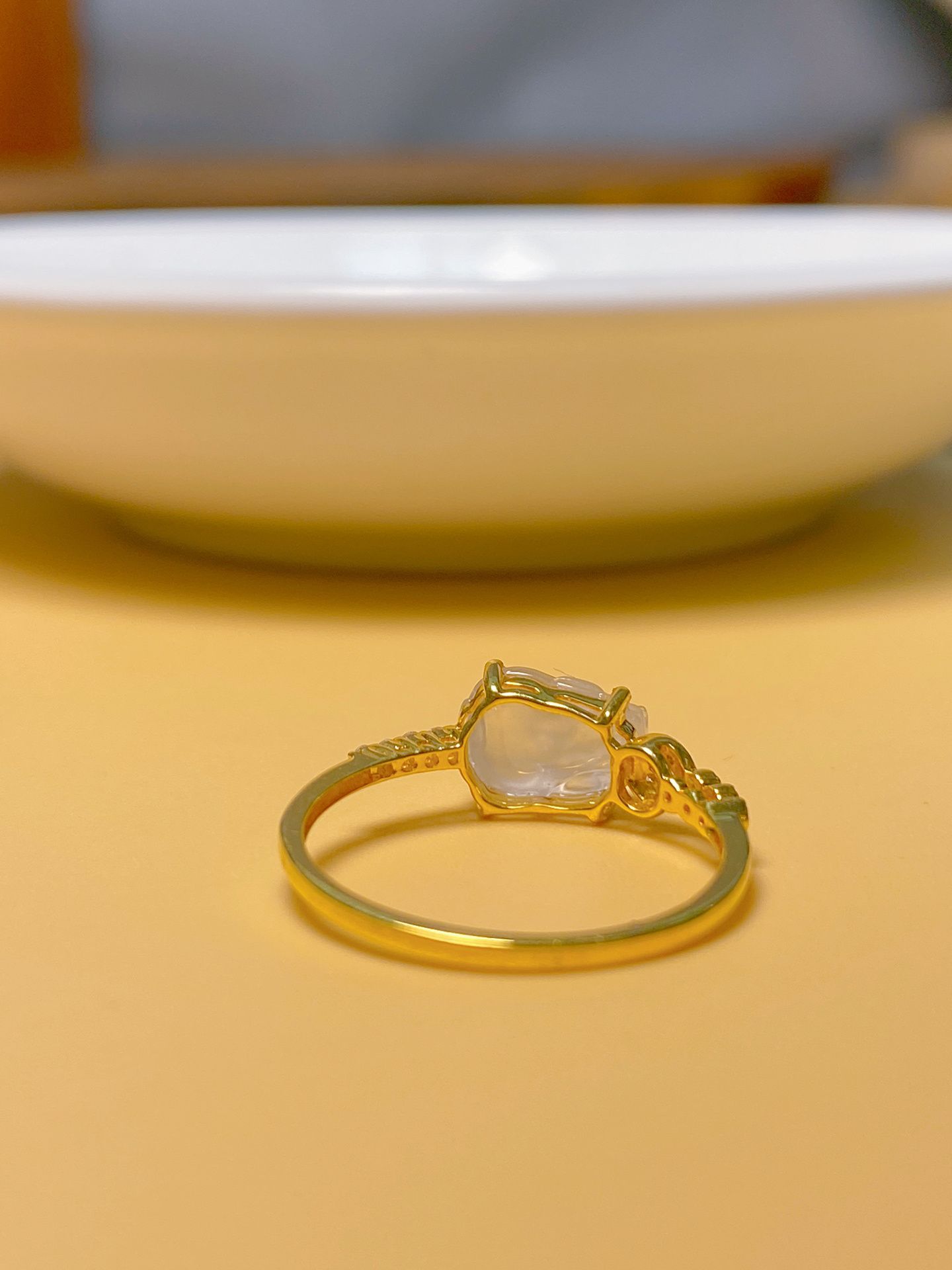 主石选用的是三足金蟾,是由冰种翡翠精心雕琢而成。这种冰透起光的翡翠种水极好,呈现出一种深入人心的美。戒指以18k金镶嵌,更在金蟾的嘴边做了一颗小金币,寓意着招财进宝。