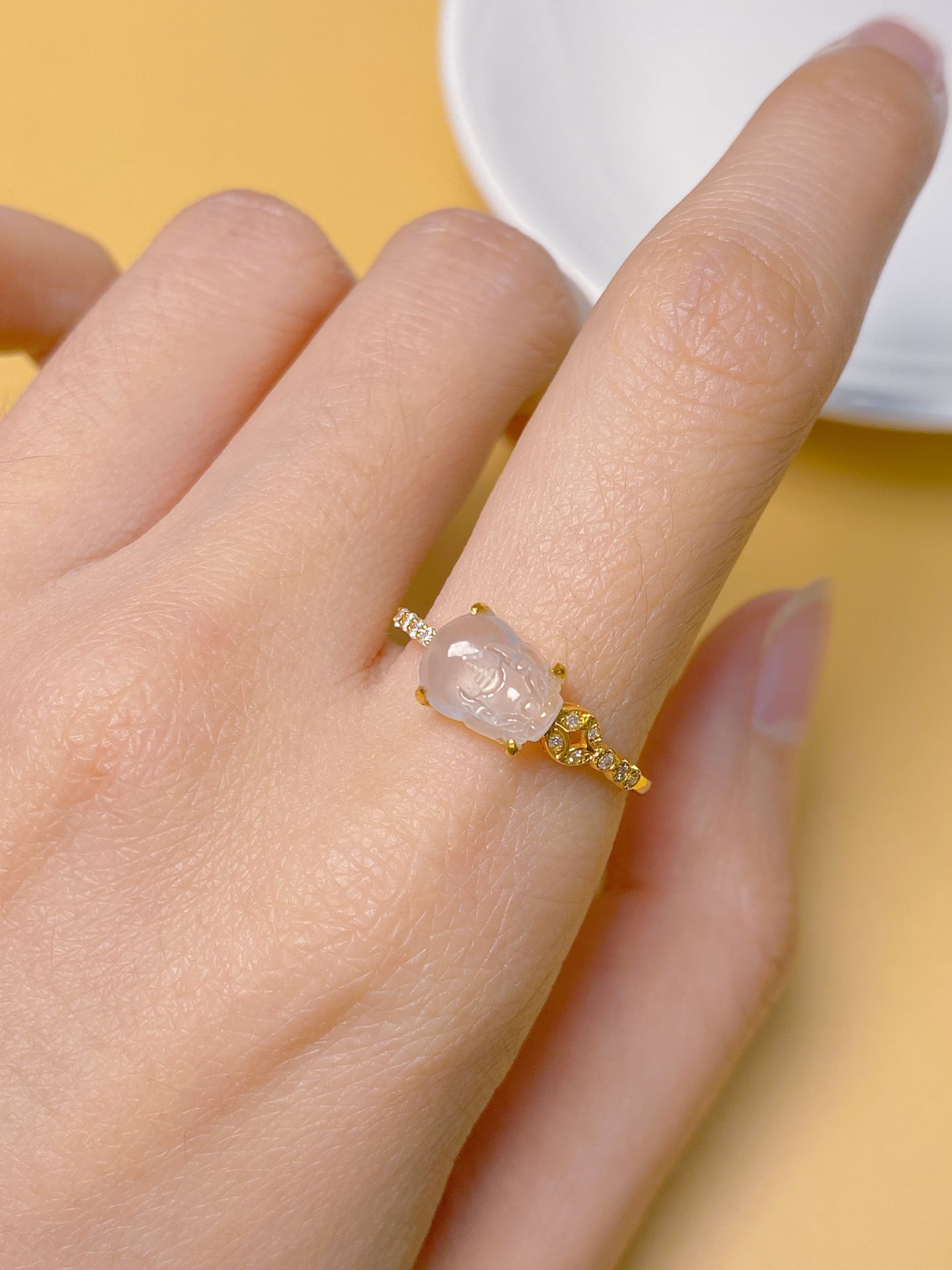 在中华文化中,"金蟾"和"貔貅"一直被视为招财的瑞兽。那么,当这两者与翡翠这一象征吉祥和美好的宝石结合时,便诞生了这枚招财金蟾翡翠戒指。