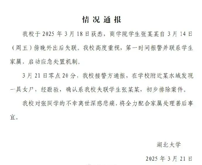 痛心!湖北大学失联女生遗体被发现,校方发布通报