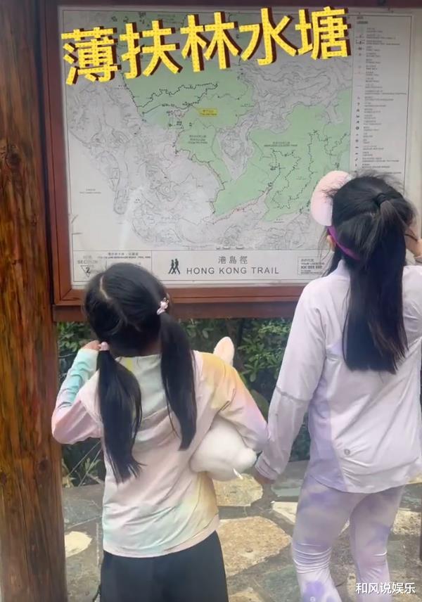 两个女儿一起爬山,一家人行走到指示牌的时候,姐姐带着妹妹看指路牌,询问妈妈他们接下来往哪里走。姐妹英语、粤语、普通话切换自如。