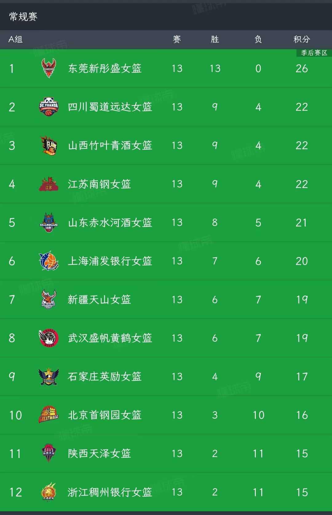 积分榜上呈现出了一超三强四中四弱,东莞13连胜继续霸榜,下场对决浙江基本将14胜收入囊中;江苏、山西、四川则都拿到9胜4负,山东、上海、武汉、新疆属于中游集团,在6到8胜之间;石家庄、北京、陕西、浙江则在2-4个胜场,难以挤进季后赛八强。B组也进行了第13轮的比赛,【3】福建金篮77-92厦门银行。剩余两场明天进行。