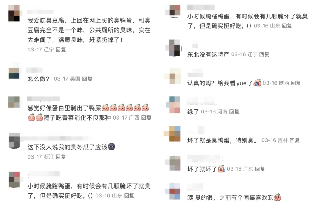 看到博主们的测评反应,东北网友称“东北没有这特产”,还有网友指出“坏了就是臭鸭蛋,特别臭”、“有时候会掩护几颗,但确实挺好吃”。