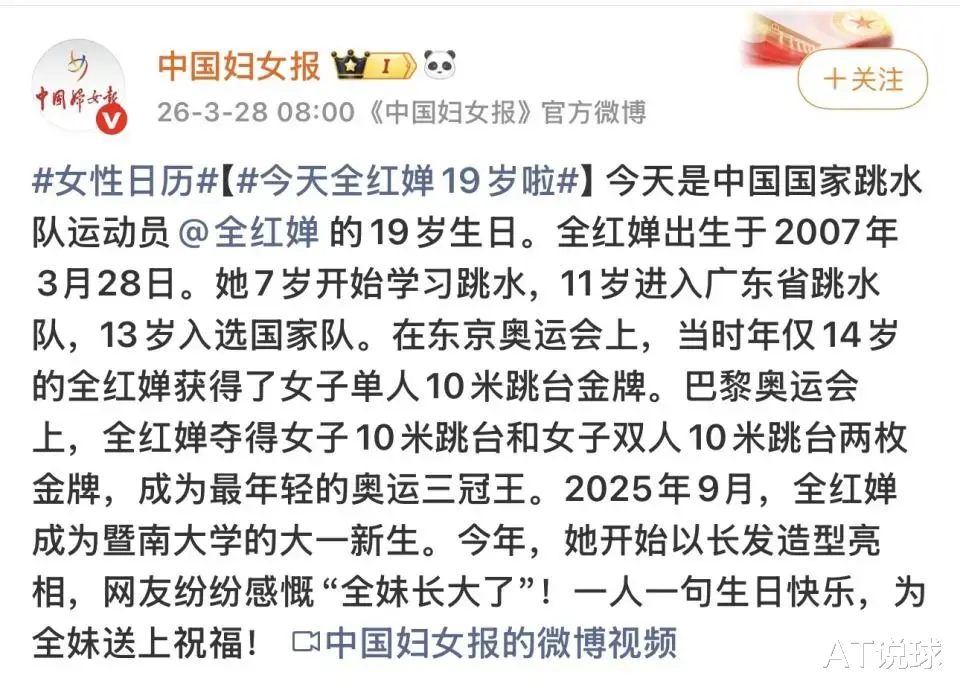 国际奥委会官方媒体在今天10点直接发文为全红婵的19岁生日送上祝福,还特意剪辑了全红婵两届奥运会拿到三枚金牌的精彩视频表现。这已经是国际奥委会自2022年起连续五年为全红婵送上生日祝福了,不仅是暖心的行为,更是赤裸裸的认可和偏爱,由此可见全红婵的实力是多么强大。