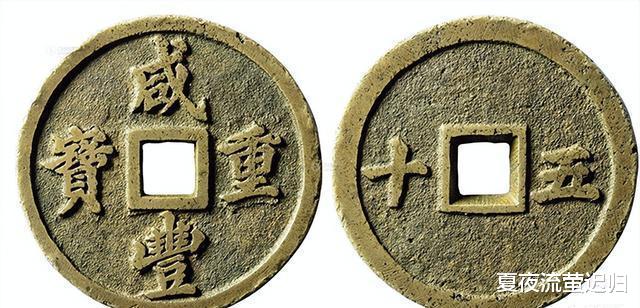 为实现有效甄别,咸丰大钱形成了两种相异称谓。其中,面额处于当五十及以下者,被命名为“咸丰重宝”;而面额达到当百及以上的,则被称作“咸丰元宝”。