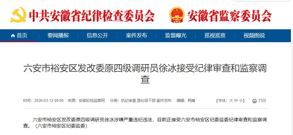丙午年二月初三日(2026年3月12日),六安市裕安区纪委监委公告:徐冰涉嫌严重违纪违法,接受纪律审查和监察调查。彼时冰已晋四级调研员,退居二线,本可优游林下,不意晚节骤毁,终陷囹圄。消息既出,裕安政商为之侧目。