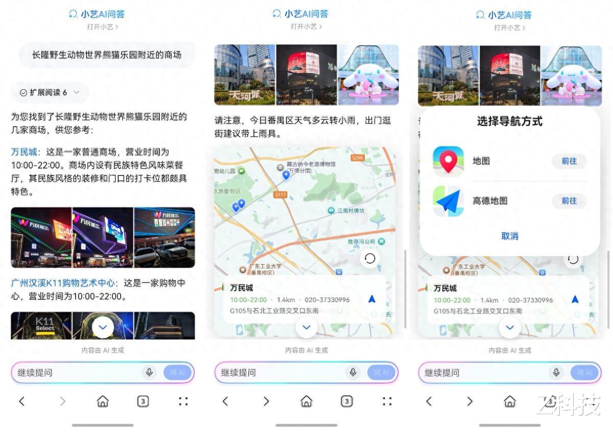 解决完脑力问题,紧接着就是行程补给问题:玩了半天想找个商场歇歇脚、顺便买点东西。人生地不熟,既要离得近,又得业态丰富。还好,我仍然可以用“AI问答-深度思考”解决烦恼,问它“长隆野生动物世界熊猫乐园附近的商场”。华为浏览器也很快回复了周边的商场列表,还给出了特色介绍和营业时间,以及地图卡片,点击一键就能跳转导航,可以说是相当贴心了。