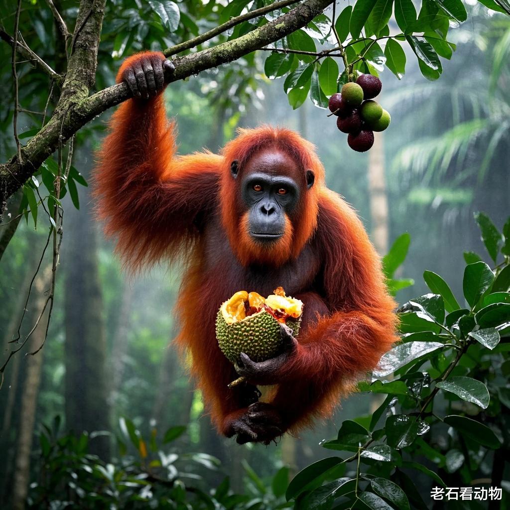 红毛猩猩是最接近纯素食的大型猿类,其饮食中约有60%是水果,其余主要为树叶、树皮和少量昆虫。它们对成熟果实有着惊人的记忆力,能够准确记住数百种植物的生长位置和结果时间,这使它们能够在广阔的热带雨林中高效地规划觅食路线。
