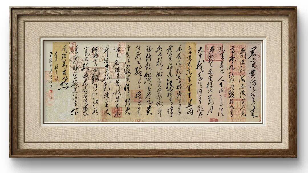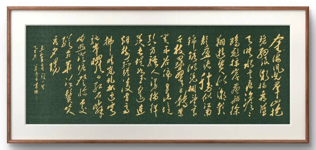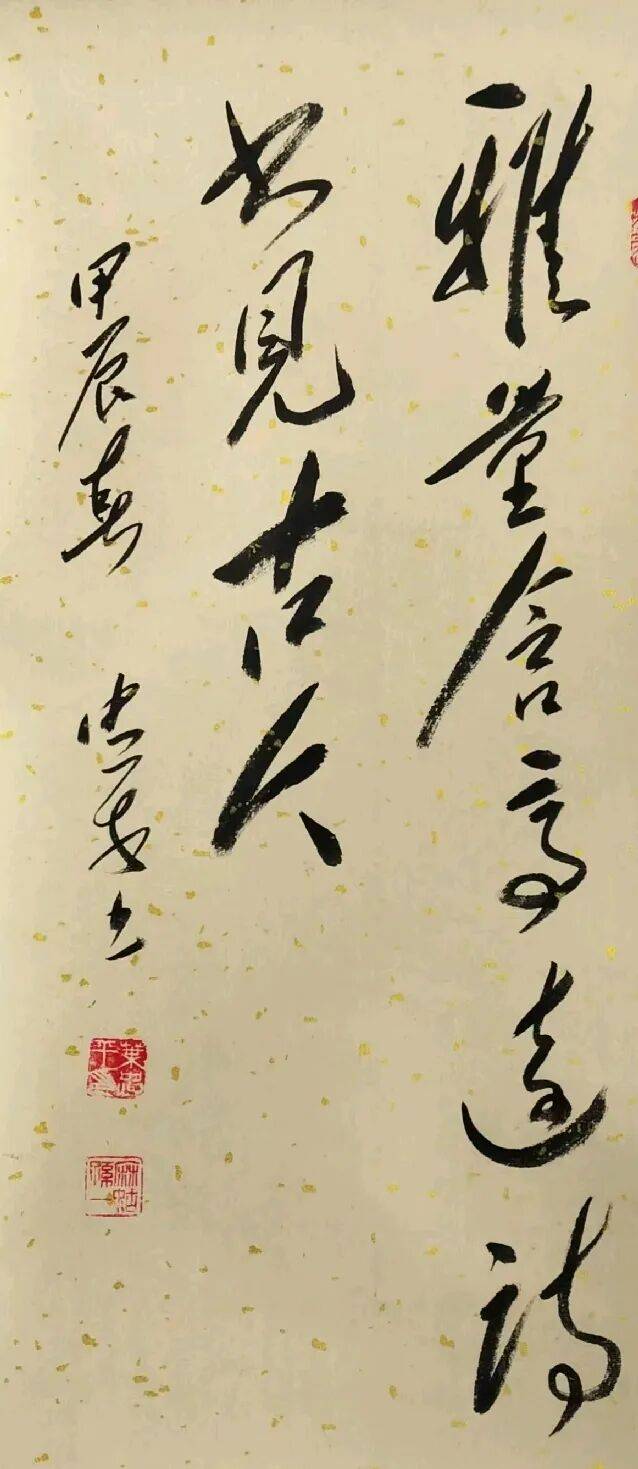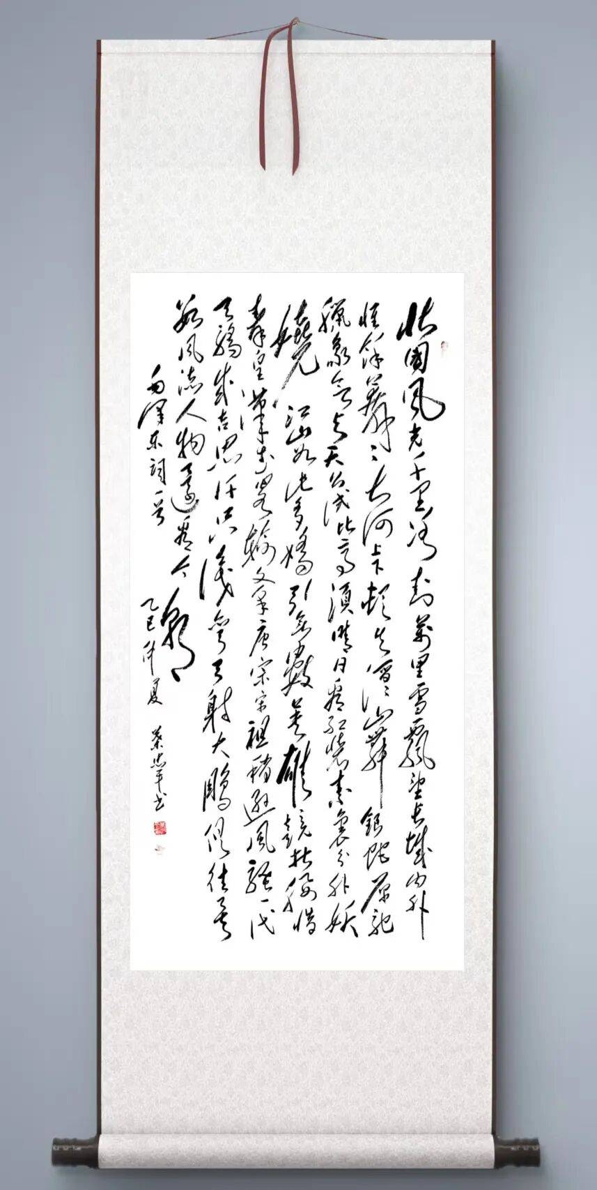 观叶忠平作品,最动人的是笔法中“雄健之气”与“灵动之韵”的共生。他深谙毛体“力透纸背”的刚劲与“汪洋恣肆”的舒展,运笔取怀素狂草之流畅、张旭飞墨之洒脱,融入魏碑金石骨力,中锋稳如磐石,侧锋灵如流水,枯笔见苍劲,浓墨显厚重,恰如伟人诗词的豪迈沉雄。其笔墨自然无滞涩,千钧之力收放自如,将毛体“欹侧取势、疏密相生”的章法精髓演绎得淋漓尽致。