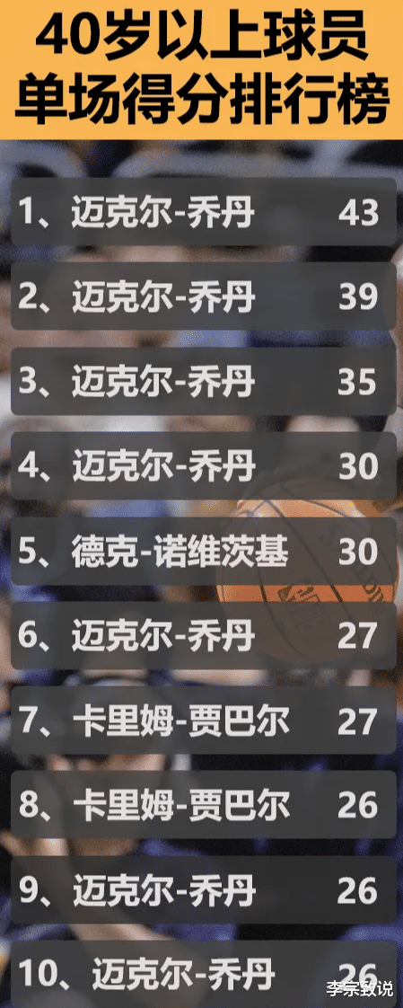 2002-03赛季,是乔丹职业生涯的最后一个赛季,刚过完40岁生日不久的乔丹,在奇才对阵篮网的比赛中,出战43分钟,30投18中,8罚7中,砍下43分10板3助4断1帽的全面数据,带领奇才以89-86击败篮网,乔丹的得分几乎占了球队总得分的一半。乔丹也成为NBA历史上唯一一位,40岁依然能够砍下40分的球员。在40岁以上球员单场得分榜中,乔丹一人就占据了前四的位置。
