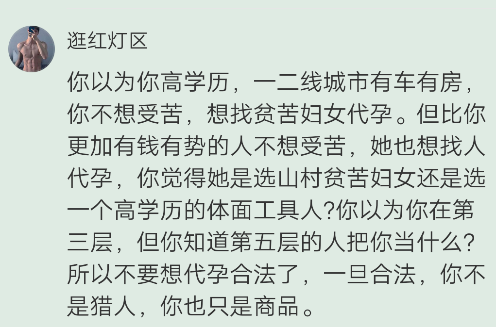 “逛红灯区”大侠的观点则更倾向为代孕者发声:代孕不应该是高阶层对低阶层的以金钱为筹码的交易,代孕不应该合法化,若是合法化,像郑爽这样的阶层也不能幸免。