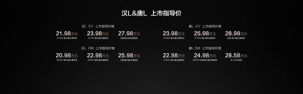 汉L DM、唐L DM搭载第五代DM技术,包含DM-p王者混动、DM-i超级混动,拥有45.3%超高热效率发动机、解耦智能电四驱等领先技术。汉L DM零百加速最快3.9s,亏电油耗最低仅3.9L/100km,纯电续航200km,综合续航里程1400km;唐L DM零百加速最快4.3s,亏电油耗最低4.9L/100km,纯电续航200km,综合续航里程1430km。