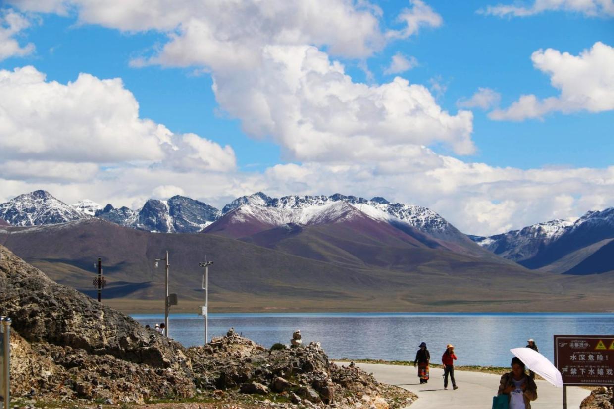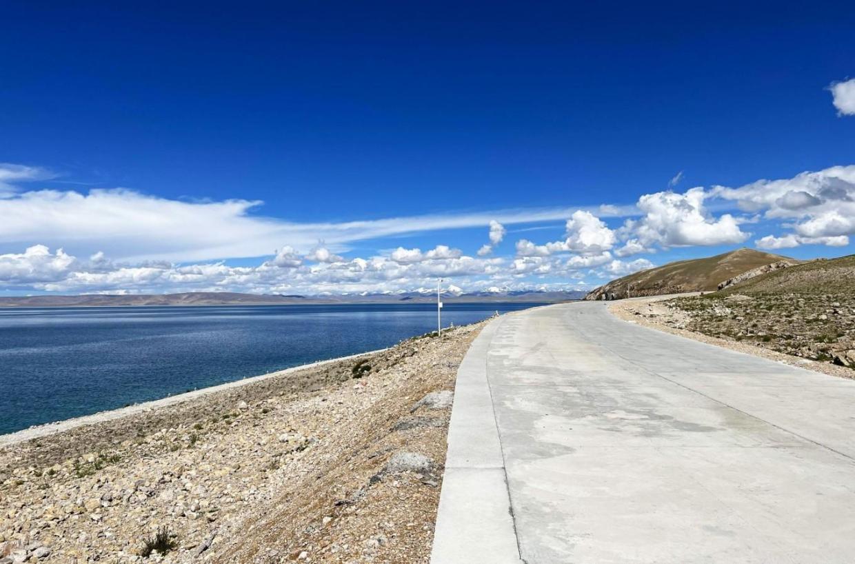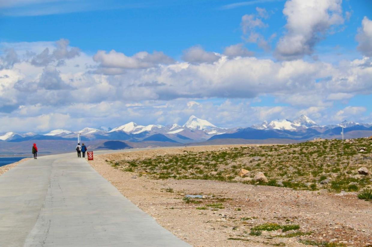 沿着公路徒步而行,隔着纳木措,远处念青唐古拉的皑皑雪峰在炙烈的阳光下放射着耀眼的银光。蓝色的天空下白云是如此之近,仿佛唾手可得,道路的尽头似乎也就那么直接进入蓝天白云里面了。