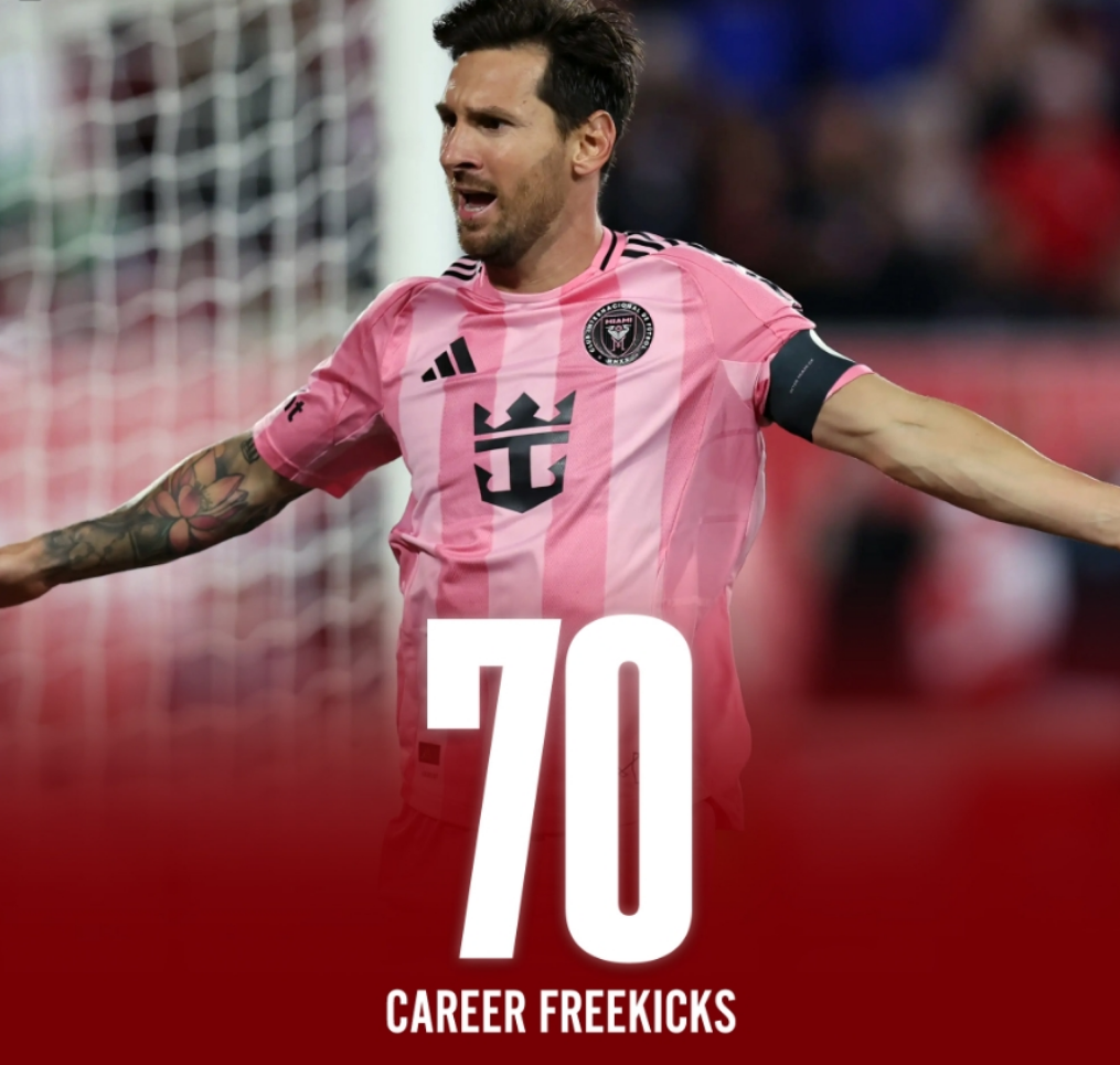 值得一提的是,第90分钟的任意球破门是梅西职业生涯第70次直接任意球得分,追平球王贝利,并列历史第二,仅次于任意球大师小儒尼尼奥的77球。尽管梅西已经38岁,但他依然能够凭借一己之力改变比赛走势。