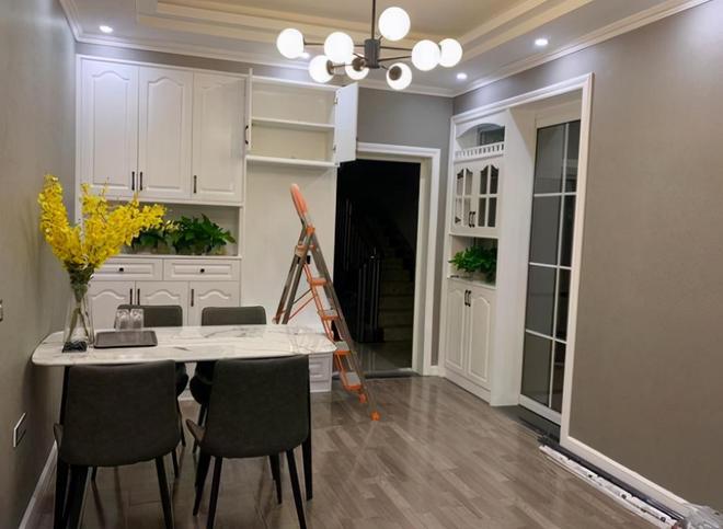 一进门就是餐厅,没有独立的玄关走廊,在墙边做了两个柜子,一个当鞋柜用,一个则作为餐边柜。