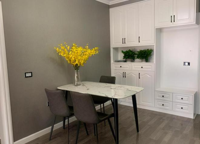 餐厅的布置很简单,墙面贴了壁布,跟餐桌椅的颜色很搭,桌面是大理石高脚餐桌,上面摆放了一束鲜花,整个空间都充满了花香。