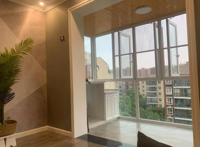天花板上做了吊顶,在四周装了筒灯增加照明,窗帘还没装上,没有装玻璃推拉门作为隔断,阳台封装起来就不怕灰尘问题了。