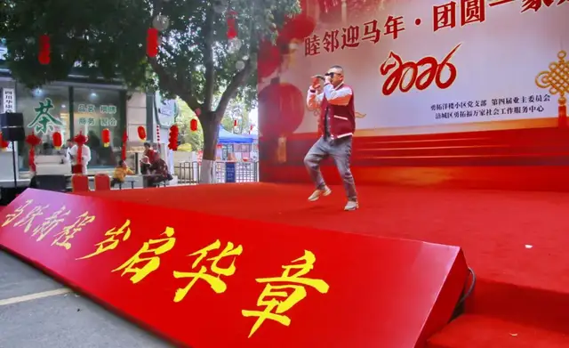 文艺演出将气氛推向高潮。佳佳舞团的《开门红》以火红的扇舞点燃全场,小朋友们跟着节奏拍手欢呼;北京音乐学院青年民歌手陈泺亦一曲《走进新时代》清澈嘹亮,居民王阿姨感慨:“这专业水平,听得人心里亮堂堂的!”原创节目《音乐快板》幽默盘点小区新鲜事,表演者肖龙巧妙地融入了小区真人真事,引得台下笑声不断。