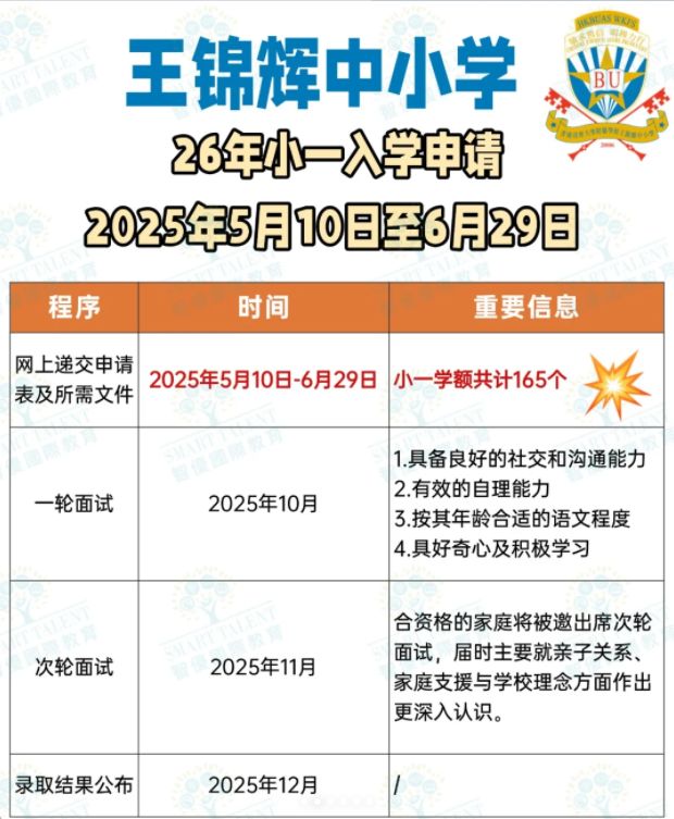 目前王锦辉26年小一申请已经进入倒计时阶段,还没开始准备的家长真的要抓紧了!