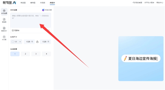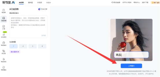 易可图是一款在线AI设计平台,它的 AI 功能十分实用,能够切实地帮助到电商、营销、内容创作者等人群,它既可以从无到有生成图片,也可以对现有图片进行二次创作,具体如下: