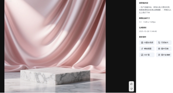 指令:一张产品展示台,高级灰色大理石材质,背景是柔和的粉色丝绸褶皱,一束柔光从左上角打下来