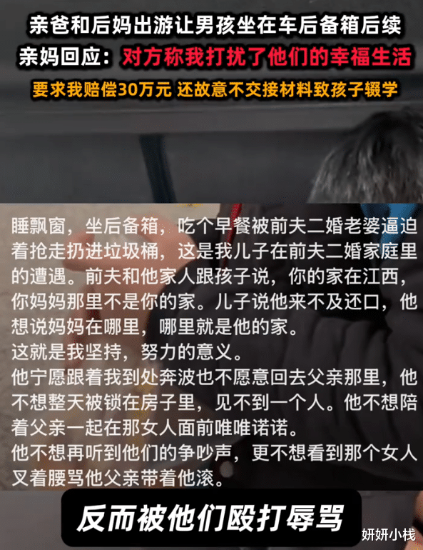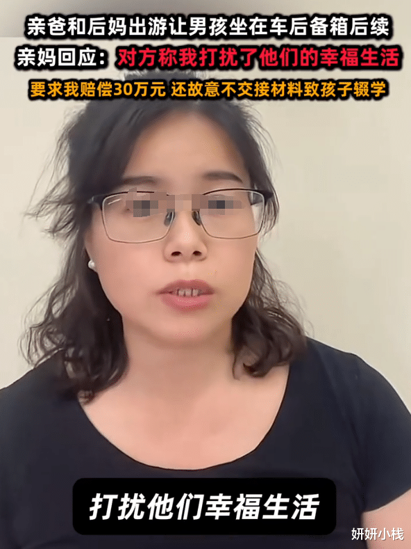 一家开车自驾游,亲爸继母却让9岁男孩坐后备箱?亲爸与亲妈吵了起来了,亲爸还要求亲妈赔偿30万元。