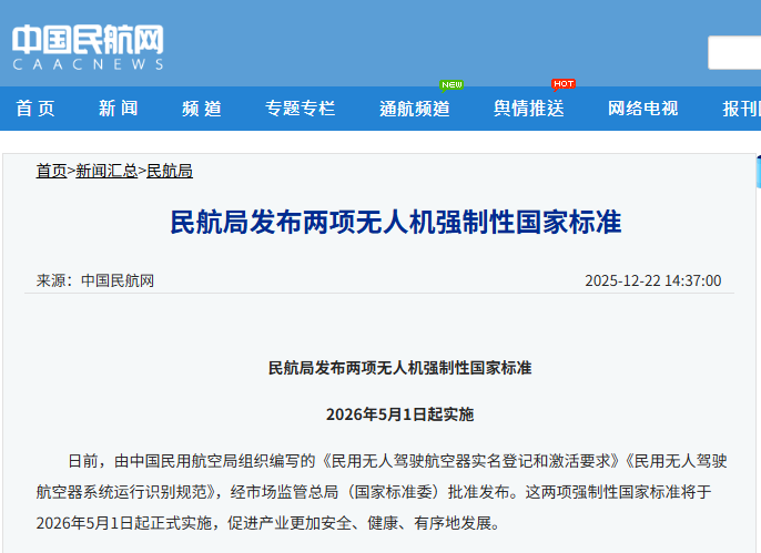 2026年5月1日:《民用无人驾驶航空器实名登记和激活要求》是国家市场监管总局2025年12月22日批准发布的强制性国家标准,于2026年5月1日起正式实施。该标准规定了无人机实名登记和激活的工作流程,明确登记主体需在使用前完成包含所有者身份信息、产品名称、型号、唯一产品识别码及使用用途等关键字段的登记操作,要求无人机在激活前和取消激活后均不能具备飞行能力。