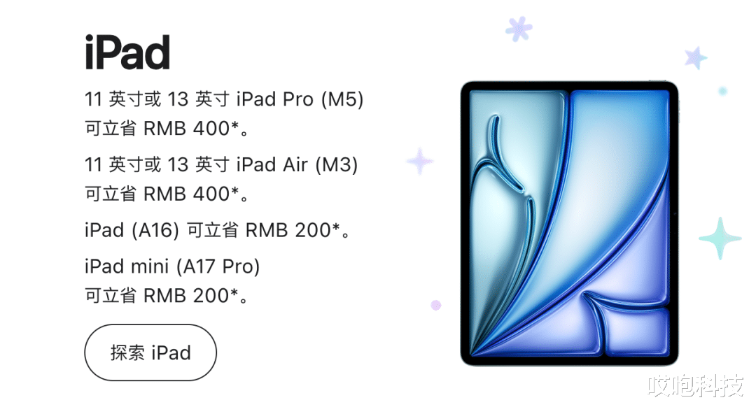 iPad 方面,iPad Pro(M5)和 iPad Air(M3)都是降价 400块,基础版 iPad 和 iPad mini 降价 200 块钱。