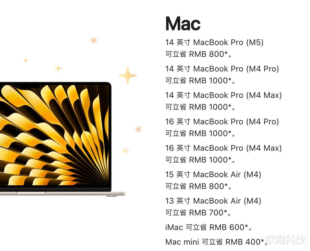 Mac 方面,14 英寸和 16 英寸 MacBook Pro(M4 Pro 和 M4 Max 版本)降价 1000 块钱;M5 MacBook Pro、M4 MacBook Air 降价 800 块钱;iMac 降价 600 块,Mac mini 降价 400 块。