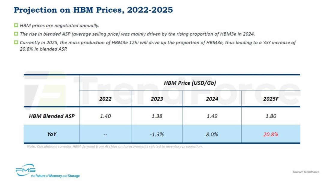 到2025年,HBM单位存储容量的价格将上涨21%。