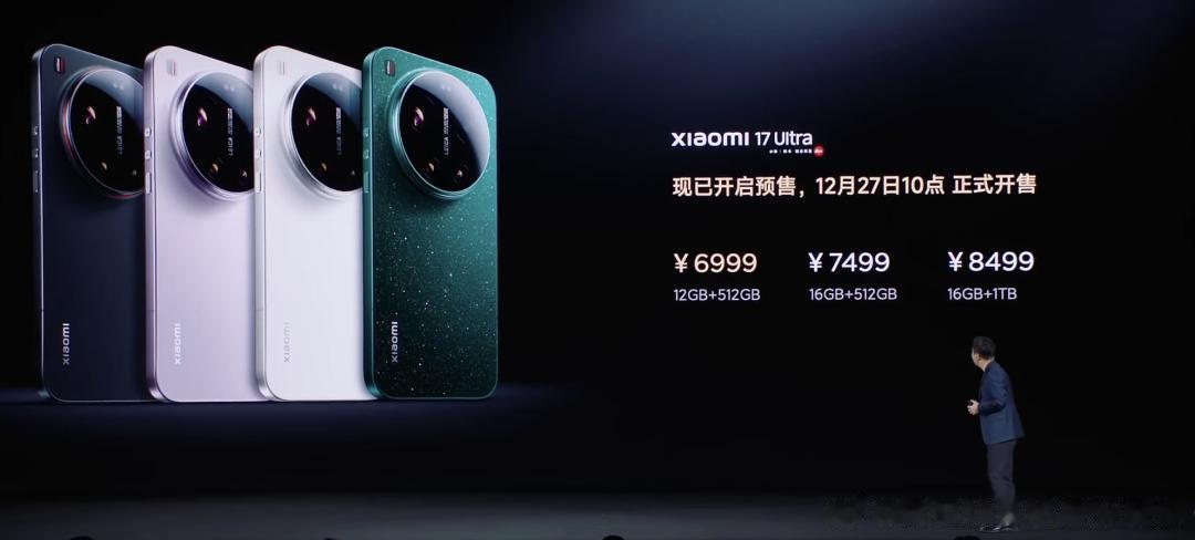 Xiaomi 17 Ultra 共有白色、黑色、冷烟紫、星空绿,四款配色可选,其中 12GB+512GB 售价 6999 元、 16GB+512GB 售价 7499 元、16GB+1TB 售价 8499 元;Xiaomi 17 Ultra by Leica 16GB+512GB 售价 7999 元、16GB+1TB 售价 8999 元。即日起在小米商城、小米之家、小米天猫官方旗舰店以及小米京东旗舰店等官方渠道开启预售,12 月 27 日早 10 点正式开售。