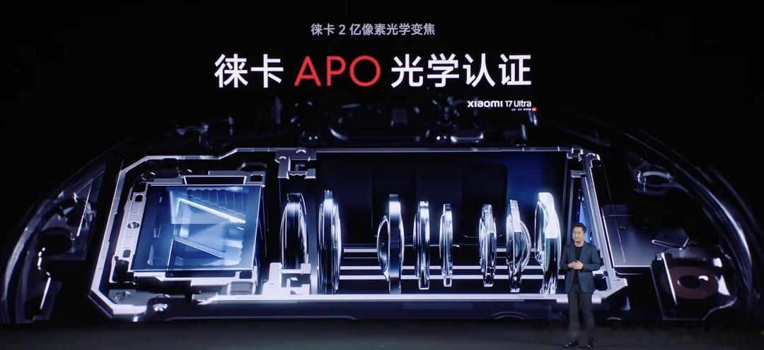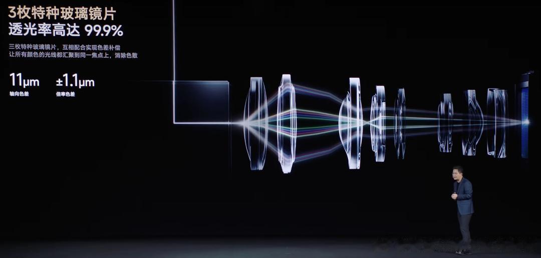 此外,小米还在这枚镜头中,独创了「三片式 APO 复消色差」光路设计,奢侈地采用了三片特种玻璃镜片,以达成最终超低色散的成像表现,在硬件层面解决了长焦焦段拍摄明暗交界处紫/绿边色差。极高的光学素质也让这枚镜头,成为行业中第一个获得徕卡 APO 光学认证的手机镜头。