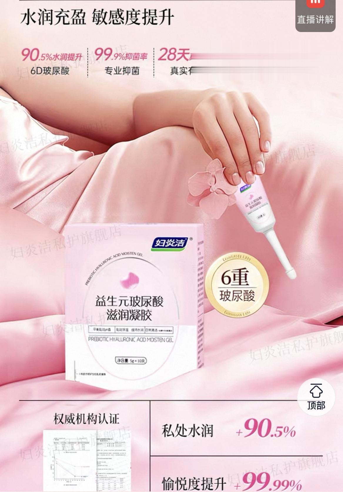 “每天一支,干净又方便”“隔天坚持用一支;能水润滋养,能平衡菌群;一招解决小花园干痒问题”,今年1月初,在某电商平台的妇炎洁私护旗舰店,视频中正在介绍的是一款名为妇炎洁益生元玻尿酸滋润凝胶的产品。