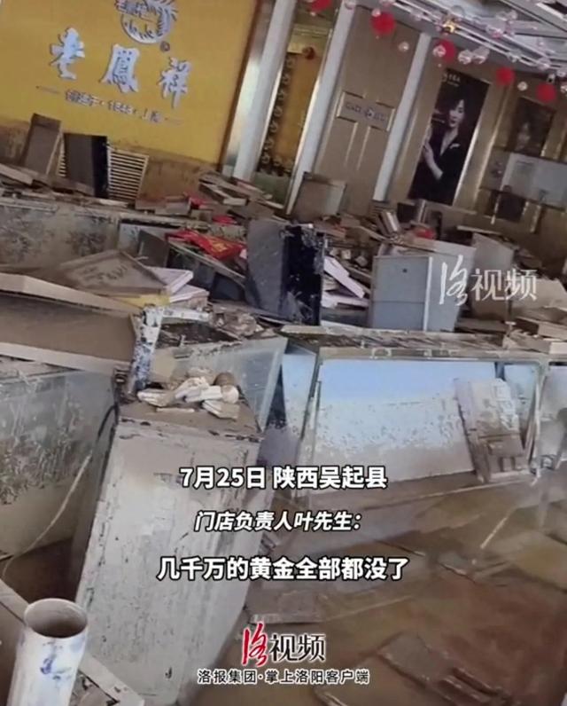 事件回顾7月25日上午,陕西吴起县突发暴雨,县里的一家老凤祥金店被洪水冲开大门,柜台连带着柜台里的金银等首饰被冲走了,存有首饰和现金的保险柜也消失不见了,光首饰的损失就高达上千万。