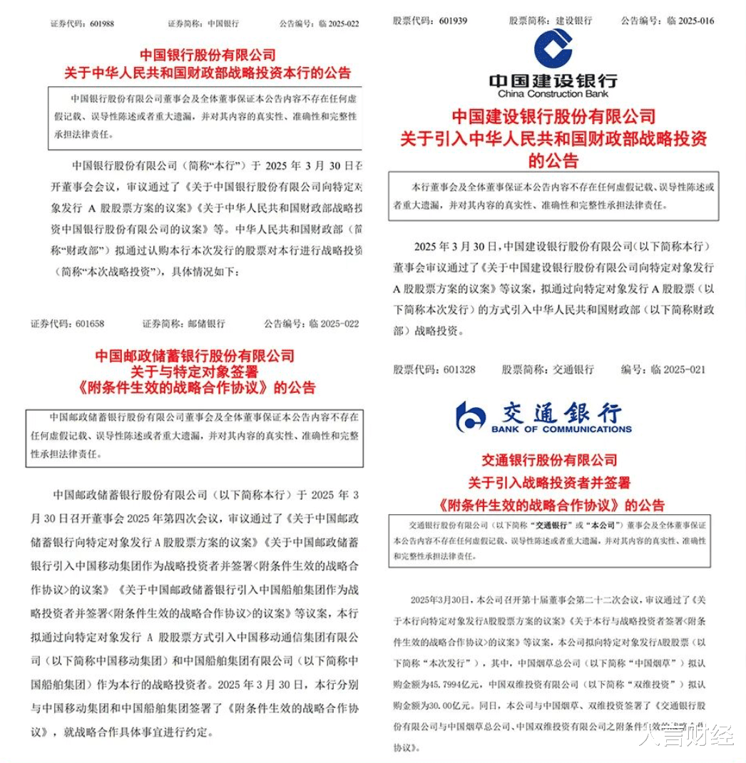 财政部携中国烟草、中国移动、中国船舶等国家队级别的大佬,向四家国有大行注资5200亿。
