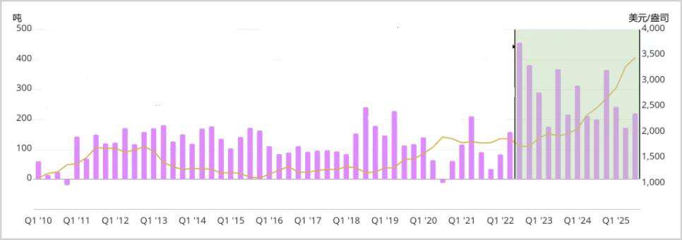 2025年4月底之前的那一轮金价狂飙,主要推动力来自全球央行的持续购金行为。数据显示,仅中国央行在2025年前四个月累计增持黄金48万盎司,而随后六个月的增持速度有所放缓,累计增持32万盎司。