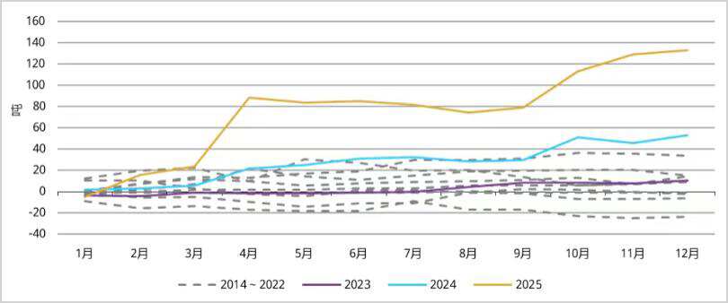 ▲黄金ETF累计月度需求量,来源:世界黄金协会