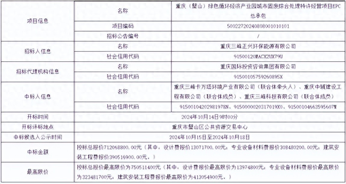 近日,重庆(璧山)绿色循环经济产业园城市固废综合处理特许经营项目EPC总承包中标结果公告发布,重庆三峰卡万塔环境产业有限公司(联合体牵头人)、重庆中辅建设工程有限公司(联合体成员)、重庆三峰科技有限公司(联合体成员)中标该项目,投标总报价71206.88万元。