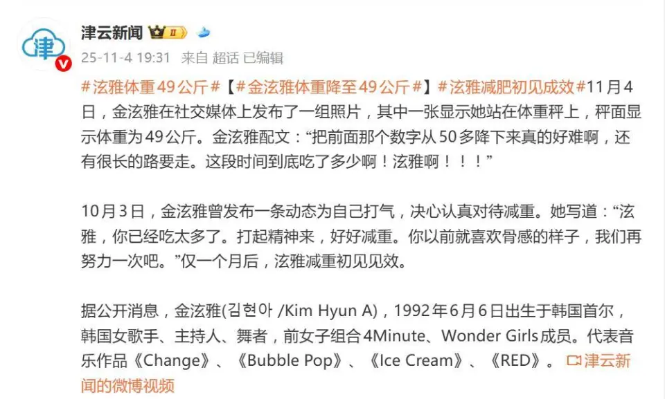 此次晕倒前,她的健康状况已埋下隐患。2025年11月初,泫雅公开体重降至49kg,身高164cm 的她BMI 仅 18.2,低于 WHO 健康标准(BMI≥18.5)。尽管她尝试通过高蛋白饮食和普拉提训练科学管理身材,但短期减重仍削弱了身体抵抗力,再加上密集演出的体力透支,最终引发旧疾复发。